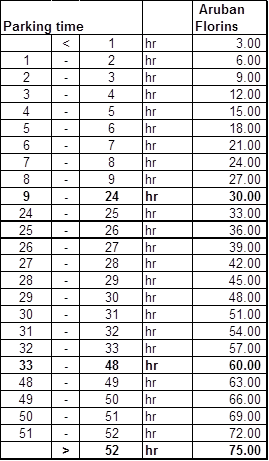 Hourly rates indicated below are applicable hourly rates; after 10 hours of parking on the first (1st) day the applicable rate is AWG 30.00. The hourly rate for the second (2nd) day will then be calculated on the next day starting at 0 hours of parking.
