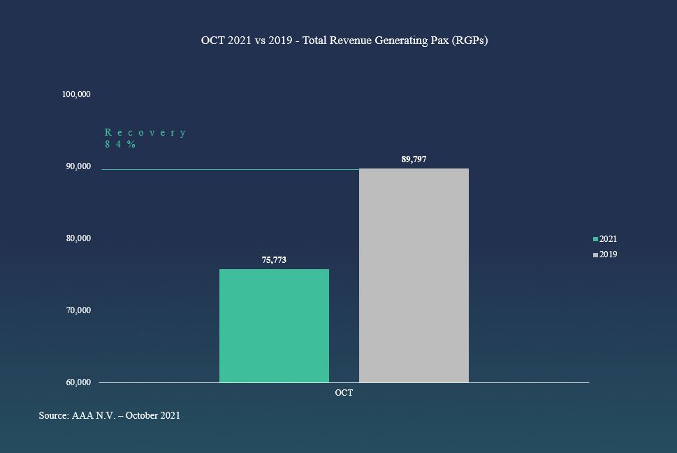 ORANJESTAD – Aruba Airport Authority N.V. (AAA) reports as follows on AUA Airport’s performance for October 2021; another month with yet another satisfying recovery rate versus the same period in 2019.