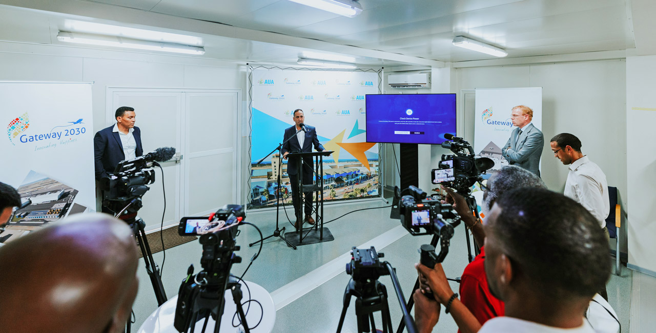 “Nos ta sumamente contento y orguyoso di por a mustra Minister Oduber e recien desaroyonan cu ta relata na e proyecto importante cu ta Gateway 2030, cu actualmente ta den su prome fase. E fase aki ta ser premira di lo ta cla den e di 3 kwartaal di 2024 y e sigiuente fase lo cuminsa e aña aki cu mobilizacion”, segun Mr. Joost Meijs, CEO di AAA.