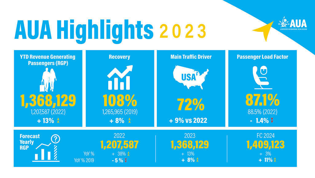 ORANJESTAD – In a remarkable feat that underscores Aruba Airport Authority N.V. (Aruba Aiport)’s commitment to excellence in contributing to Aruba’s aviation and travel industry, the final traffic numbers for 2023 have surpassed all expectations, firmly establishing the airport as a regional contender showing unprecedented growth and success.