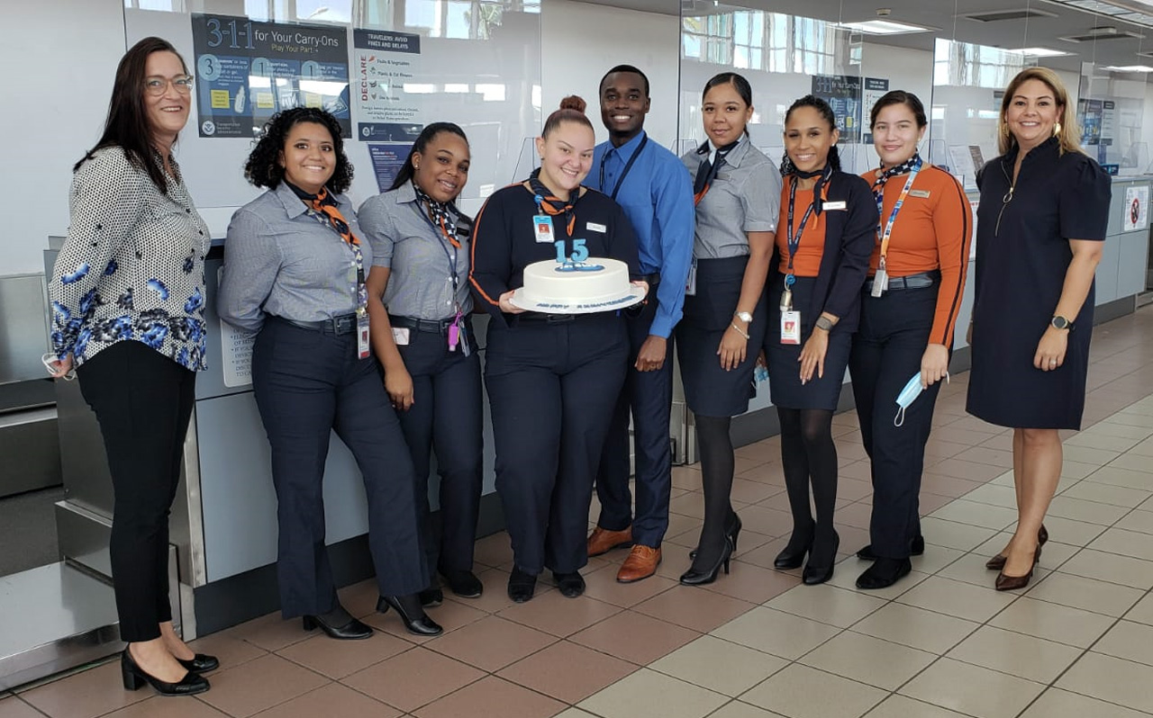 ORANJESTAD: Riba diaranson, 15 di September, 2021, e ekiponan di AUA Airport y JetBlue Airways a celebra cu bolo y snacks, e di 15 "Blueversary" (aniversario) di JetBlue operando na Aruba.