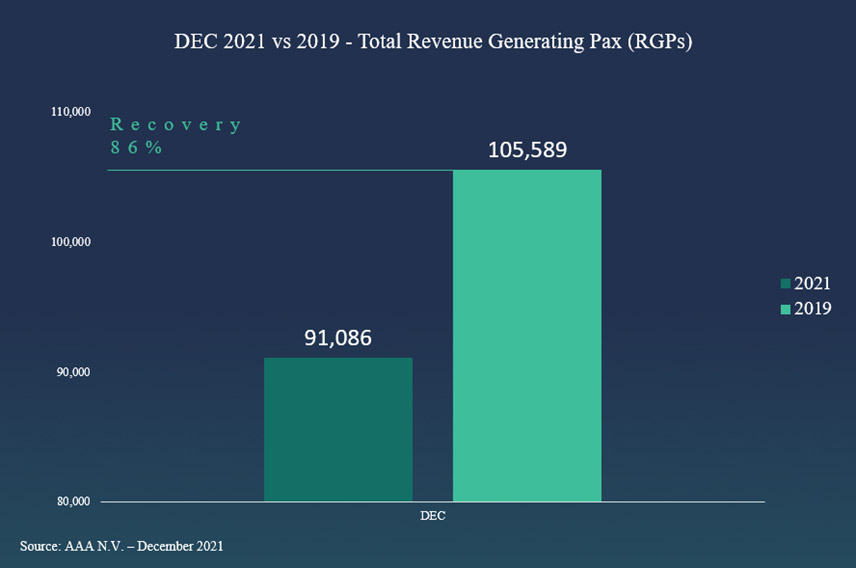 Den December 2021, AUA Airport a atende 91,086 pasahero cu a biaha for di Aruba. Esaki a resulta den 7% mas pasahero compara cu e luna prome. Durante e luna aki AUA Airport a recupera 86% di e cantidad di pasaheronan cu a wordo procesa na 2019 durante e mesun luna. Na December 2021 67,011 pasahero (pax) a biaha pa Merca, 3,764 pax pa Canada, 6,963 pax pa Europa, 3,592 pax pa Antiyas Hulandes, y 9,756 pax pa Latino America.