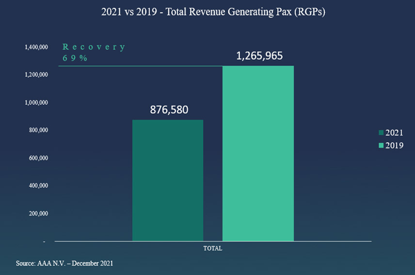 Na 2020 AAA a premira pa 2021 un recuperacion di aproximadamente 50% compara cu 2019. Pero e ultimo aña a demostra un recuperacion mihor di loke a spera y a yega na un total di 69% di recuperacion pa 2021 compara cu 2019. Compara cu 2020 AUA Airport su cantidad di revenue generating passenger a aumenta cu 104%.