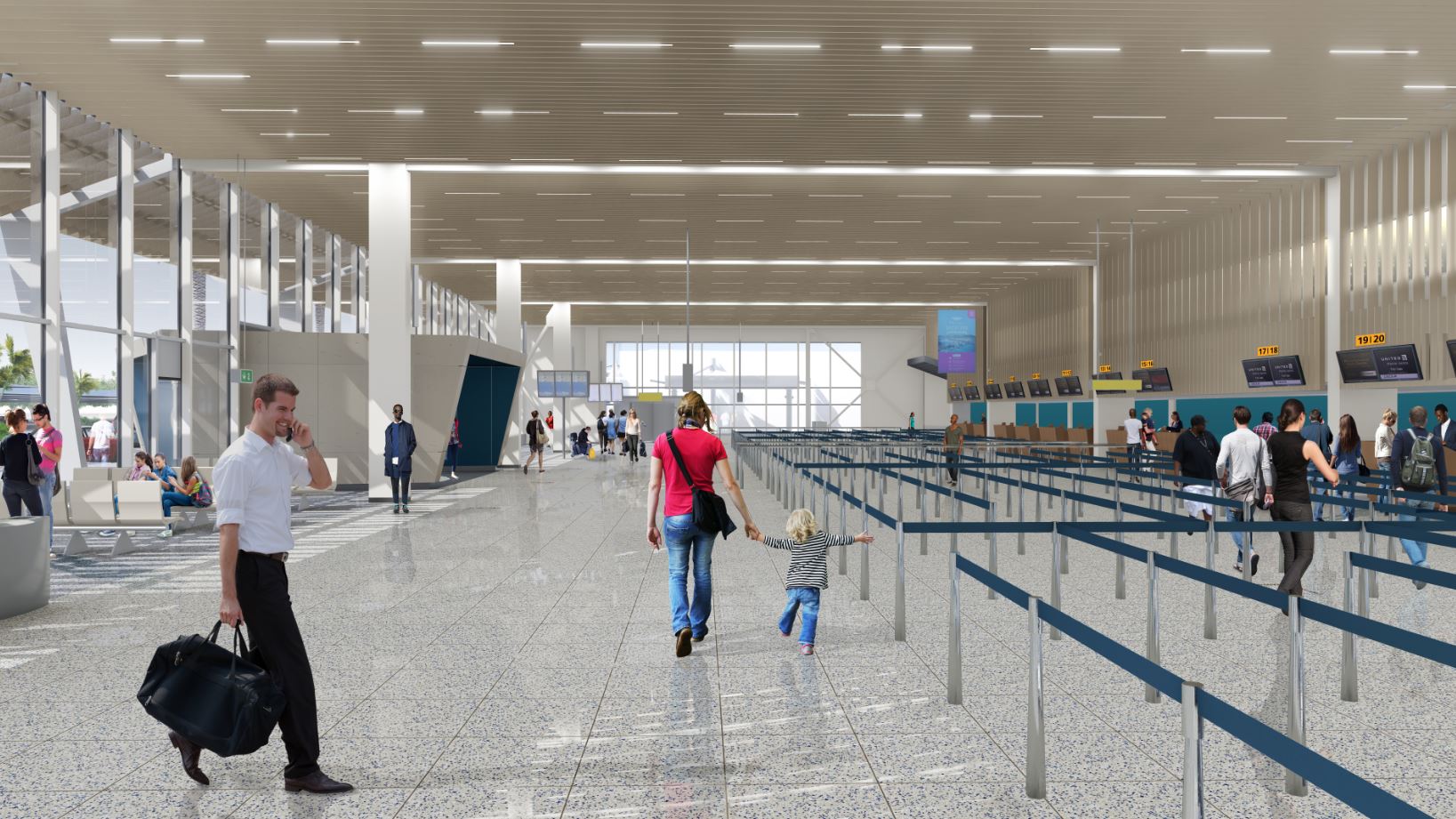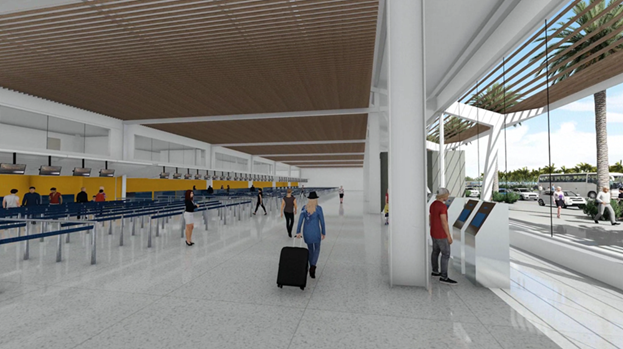El proyecto en curso, conocido como Gateway 2030, representa una inversión significativa en la modernización e innovación del Aeropuerto Reina Beatrix para superar las limitaciones de capacidad y ofrecer una experiencia aeroportuaria de clase mundial. La Fase 1A está avanzando rápidamente y está lista para presentar una nueva sala check-in, sala de equipaje y oficinas de aerolíneas en EE. UU., mostrando una fusión perfecta de tecnología de punta y principios de diseño sostenible cuando esté operativa.