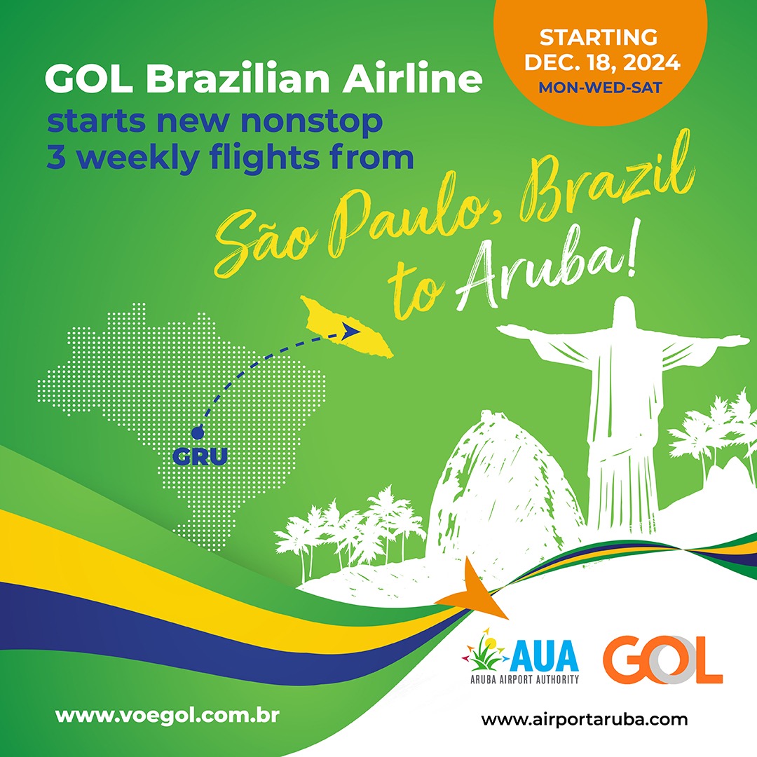 La Autoridad Aeroportuaria de Aruba N.V. (AAA) anuncia con mucho orgullo que GOL Airlines, una aerolínea Brasilera, empezará con vuelos directos saliendo desde el Aeropuerto Internacinal de Guarulhos–Governador André Franco Montoro (GRU) en São Paulo hacia el Aeropuerto Internacional Reina Beatrix. GOL comenzará a volar para Aruba desde el 18 de diciembre del 2024; Este vuelo se considera que es uno de distancia larga de 6 horas y media.