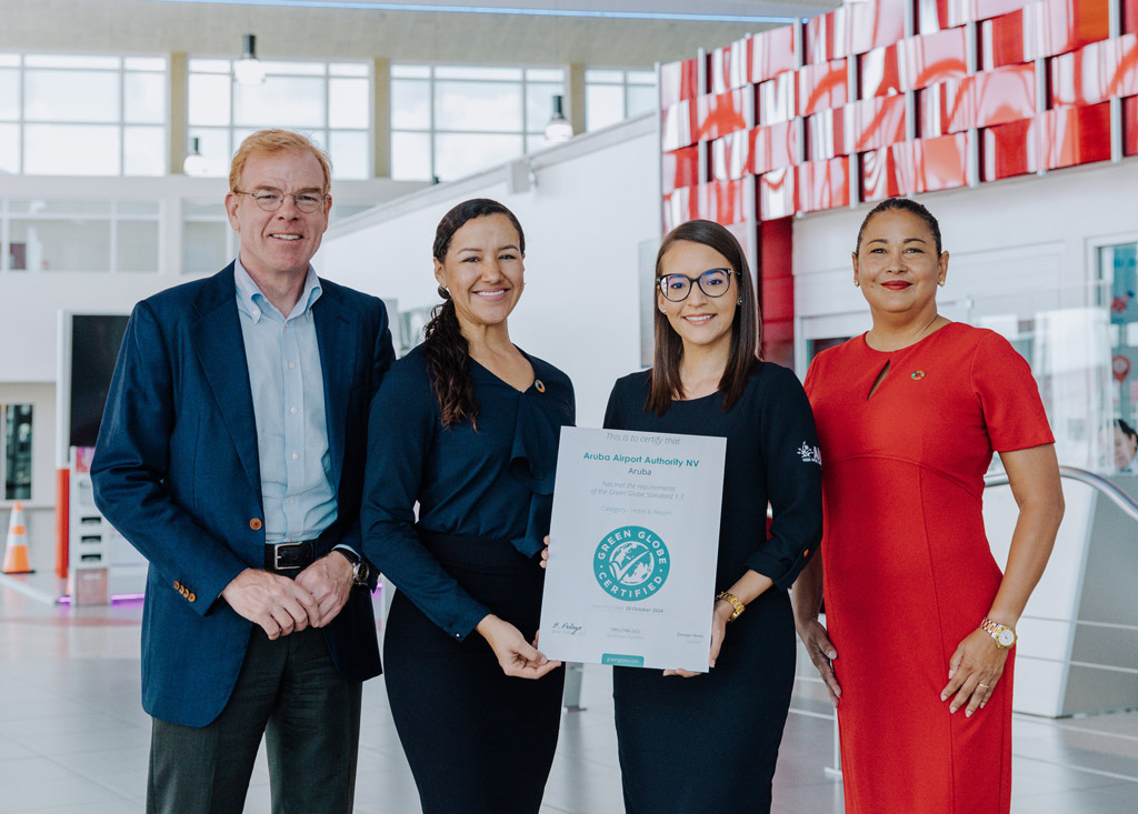 ORANJESTAD – Después de convertirse en el primer Aeropuerto del mundo en recibir la certificación Green Globe en 2022, la Autoridad Aeroportuaria de Aruba N.V. (AAA) recibió la emocionante noticia de que el Aeropuerto Internacional Reina Beatrix (Aeropuerto de Aruba) recibió su segunda certificación Green Globe consecutiva el 2 de octubre de 2023.