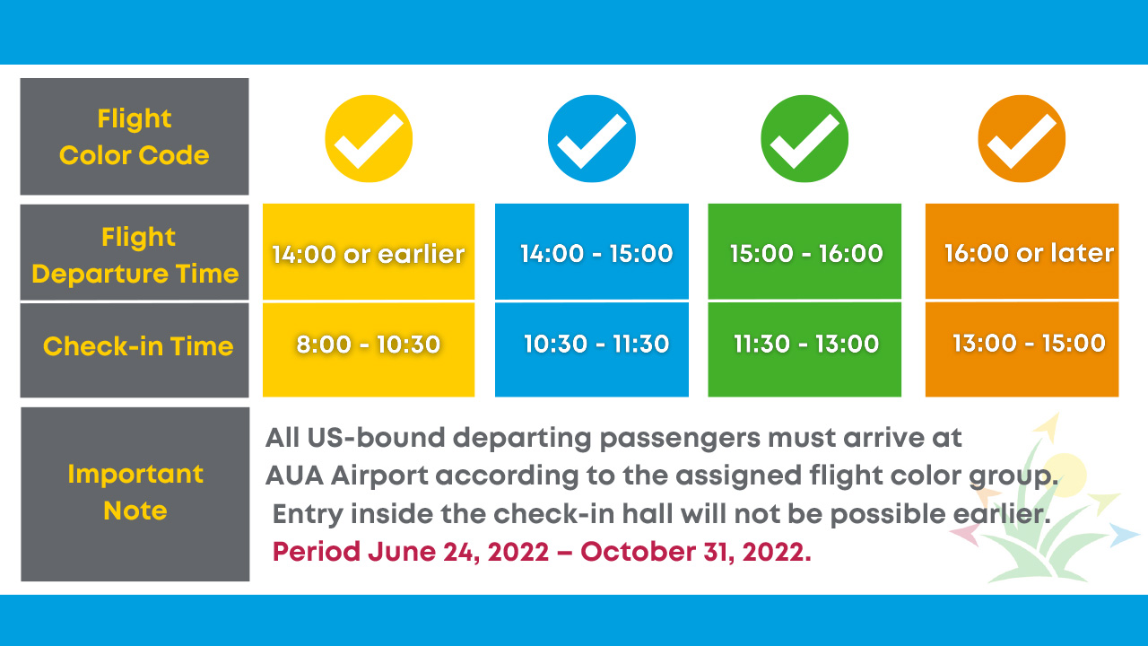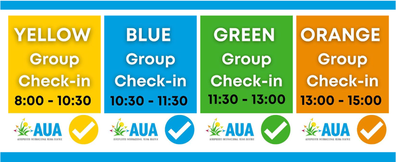 ORANJESTAD – Aruba Airport Authority N.V. (AAA), the company that manages and operates Aeropuerto Internacional Reina Beatrix (AUA Airport) hereby informs that as of June 24, 2022, all US departing passengers are allowed access to the US check-in terminal based on 4 groups and color codes at the airport as part of the “Passenger Flow Control”.