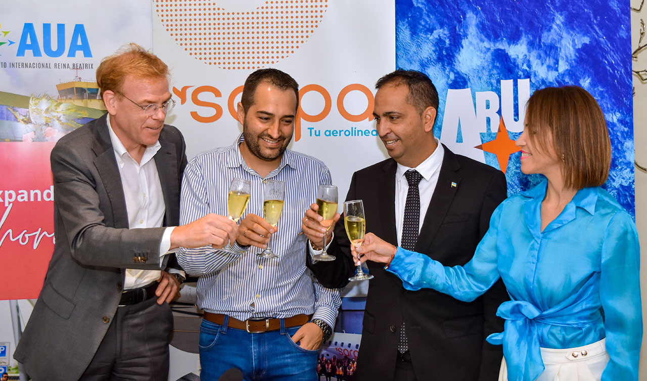 Sr. Carlos Andres Mesa, Presidente & CEO di SARPA, hunto cu Minister di Turismo y Salubridad Danguillaume Oduber, CEO di AAA Sr. Joost Meijs, y CEO di ATA, Sra Ronella Croes a anuncia officialmente e comienso di SARPA su operashon commercial December binidero.